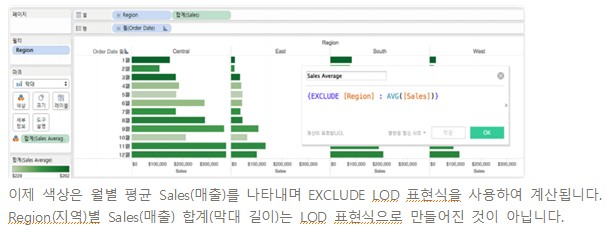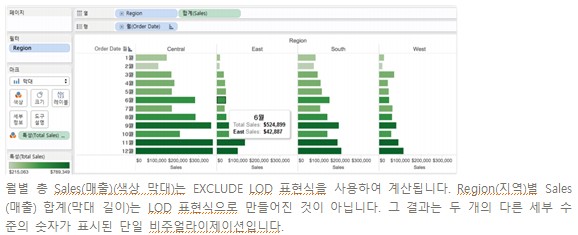 {EXCLUDE [Region] : SUM([Sales])}이라는 표현식을 사용하면 Tableau가 Region(지역)차원을 제외하고