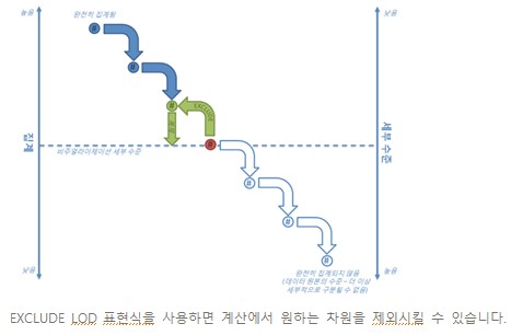 다음 흐름 도표는 Tableau에서 EXCLUDE LOD 표현식이 수행되는 방법에 대한 시각적인 설명입니다.