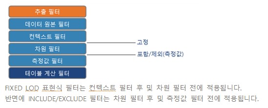 INCLUDE/EXCLUDE 및 FIXED의 주요 차이점은 아래 표시된 것과 같이 필터링 계층 상의 각 위치입니다.