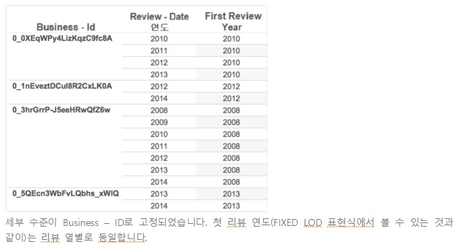 이 LOD 표현식은 Business ID별로 세부 수준을 고정합니다.