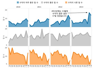 일일 수익 KPI : 월별로 수익이 아주 많거나, 수익이 많거나 수익이 낮은 날은 각각 며칠입니까?