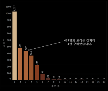 주문 수에 대한 히스토그램 : 세그먼트별 주문 수가 1개 , 2개 , 3개 등인 고객이 몇 명입니까?