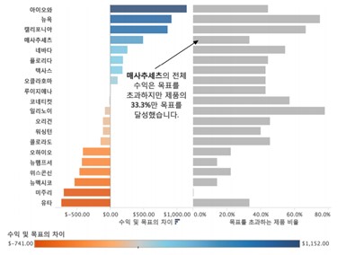 실제 및 목표 비교 : 주별 수익 목표를 달성하는 제품 비율은 얼마입니까?
