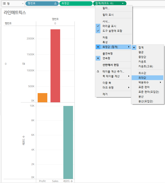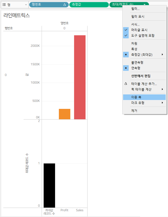 2)이후 측정값과 최대(레코드 수)를 이중축으로 지정하여 줍니다.