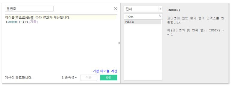 1)올라가 있는 [열번호] 오른쪽 클릭 후 테이블 계산 편집에서 아래와 같이 적용