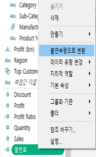 1)측정값 (연두색) 으로 되어 있는 필드를 오른쪽 클릭하여 불연속형 (파랑색) 으로 변환하여 줍니다.