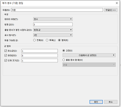 2) 매개변수 만들기 창에서 아래와 같이 지정하여 만들어 줍니다.