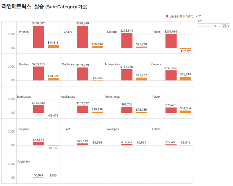 ▶라인매트릭스 작동 설명 1)가로 라는 매개변수를 활용하여 선택한 값을 기준으로 가로에 차원 수를 나타냅니다. (총 17개에 [Sub-category]를 기준으로 3칸을 선택 시 3*6 형태로 그래프를 나타냅니다.) 2) 또한 왼쪽부터 [Sub-Category], [Sales], [Profit]를 나타냅니다.