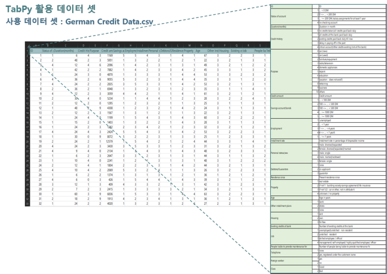 data=pd.read_csv(r'C:\Users\SAMSUNG\Desktop\tabpy\GermanCreditData.csv') 학습시킬 .csv 파일 불러오기