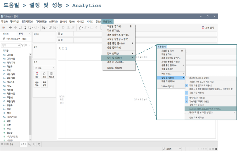 Tableau Desktop에서 상단의 도움말 > 설정 및 성능 > Analytics 확장 프로그램 연결관리를 선택합니다.