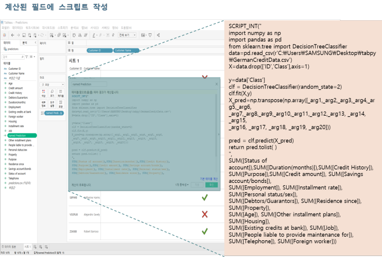 다음으로는 GermanCreditData.csv 를 사용하여 tabpy를 통해 고객의 대출 상환 여부 예측치를 나타내는 시각화를 진행해보겠습니다.