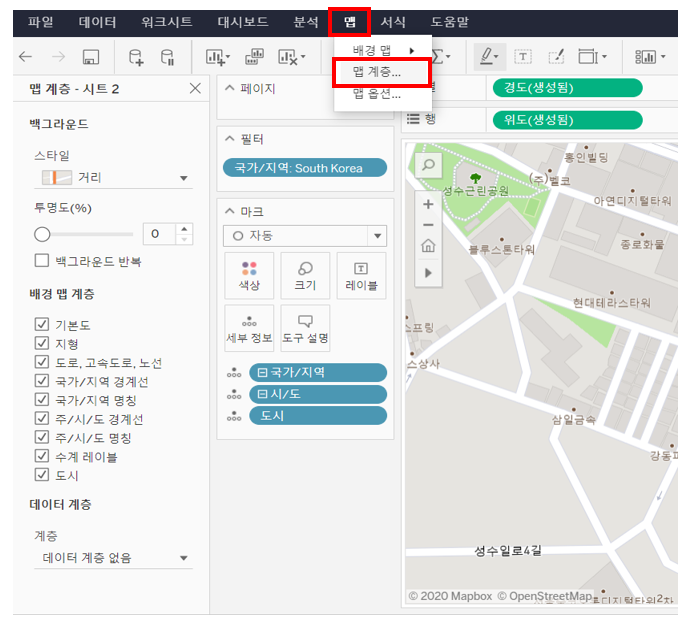 Tableau Server에서 지도가 있는 시트를 편집하여 상단의 [맵]에서 [맵 계층]을 눌러주세요~