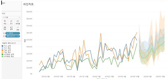 왼쪽은 매출값의 막대 그래프 , 오른쪽은 매출값의 라인그래프입니다.